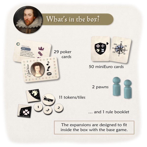- Módulo “Indirectas” – Que añade dos tipos de cartas de sigilo para mezclar en el mazo. Las cartas con símbolos de brújula dicen en qué dirección viajó la Dama Oscura desde su última ubicación, y las demás muestran el color posible de su ubicación actual.